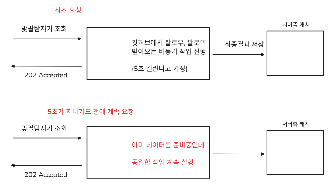 이 때, 사용자측에서 기다리지 않고 계속 동일한 API를 호출하면, API 서버 쪽에서는 아직 응답을 위한 데이터가 캐시에 존재하지 않는다고 판단하여 계속 깃허브에서 데이터를 받아오고 캐시에 저장하는 동일한 작업을 수행하게 된다.