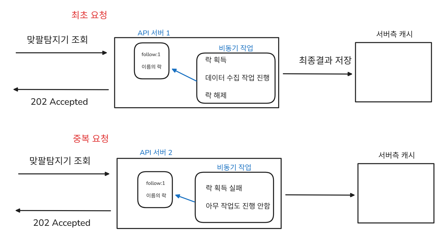 그냥 RDB에 락을 PK로 두는 테이블을 하는 구조로 만들까도 고민해 봤는데 클라이언트에서 같은 API를 데이터가 조회할때 까지 폴링 + 사용자가 강제 갱신 버튼까지 누를 수 있는 상황이라 생각보다 락 획득이 많이 발생할 것 같아서 Redis를 이용한 분산락으로넘어가기로 결정했다.