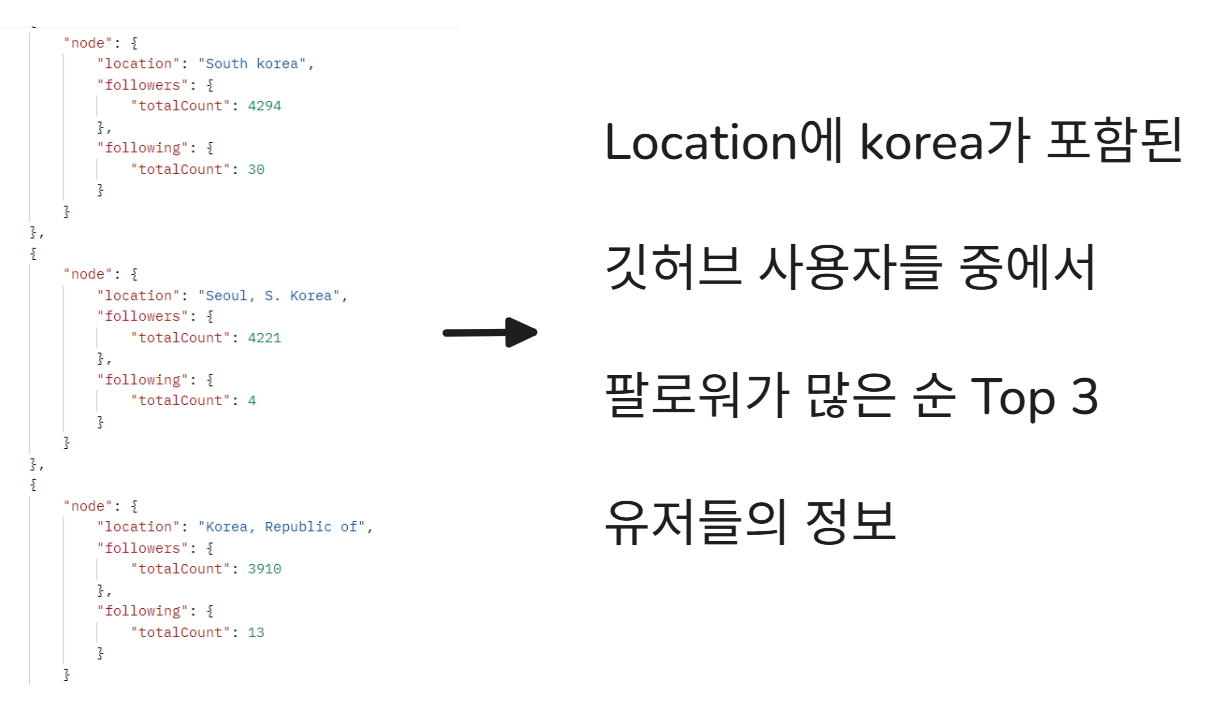 search(query: "location:Korea sort:followers-desc", type: USER, first: 100) {