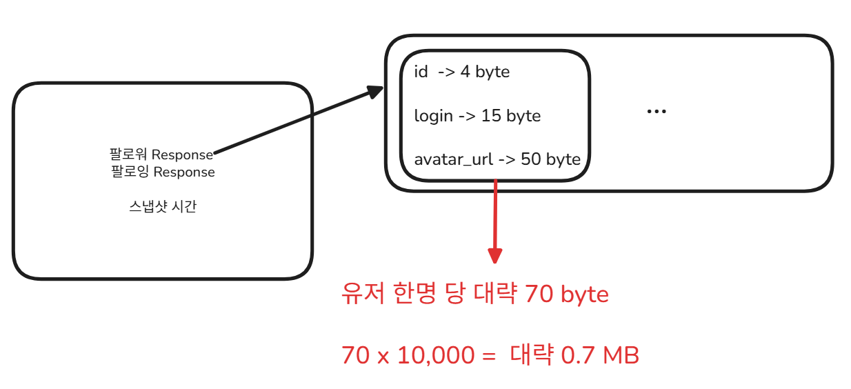 모든 한국 유저를 대상으로 한 데이터분석은 아니라서 정확하지 않을 수 있겠지만, 대략 한국 유저들 중에는 팔로워 + 팔로잉 수를 모두 합쳐도 10000명을 넘는 유저는 존재하지 않을 것 같았다. 따라서 우리 서비스를 이용하기 위한 사용자의 깃허브 팔로워 + 팔로잉 조건을 10000명으로 잡기로 결정했다. 최악의 경우 한 유저의 팔로잉, 팔로워 정보를 캐시하기 위해서는 0.7 MB의 용량이 필요하다고 판단했다.