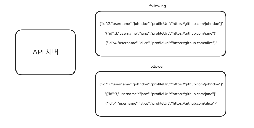 우리 API 서버에서 깃허브에 특정 유저의 팔로워, 팔로잉 리스트 조회 요청을 보내면 위와 같은 데이터가 팔로워 + 팔로잉 수 만큼 오게 된다.