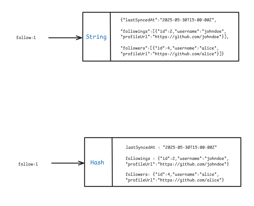 Redis의 String이나 Hash를 사용하는 경우, 데이터를 JSON 형태로 직렬화하여 그대로 저장할 수 있다. String을 사용할 경우 구조가 단순해 개발이 매우 간단해진다는 장점이 있다. 반면, Hash를 사용할 경우 조금 더 복잡해지기는 하지만, 저장된 데이터 중에서 followers, followings 등을 개별적으로 분리해 다룰 수 있다는 이점이 있다.