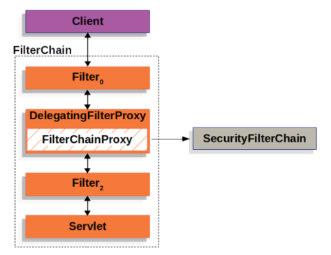 클라이언트의 요청이 발생하면, 해당 요청은 먼저 서블릿 필터 체인을 따라 이동하다가 DelegatingFilterProxy를 만나게 된다. DelegatingFilterProxy는 스프링 빈 저장소에서 springSecurityFilterChain이라는 이름으로 등록된 빈을 찾아 요청 처리를 위임한다.