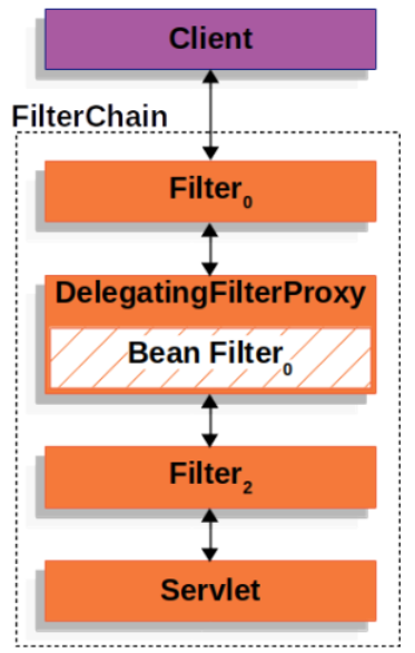 DelegatingFilterProxy는 서블릿 필터 체인과 스프링 컨테이너 사이에서 두 환경을 연결해주는 다리 역할을 한다.