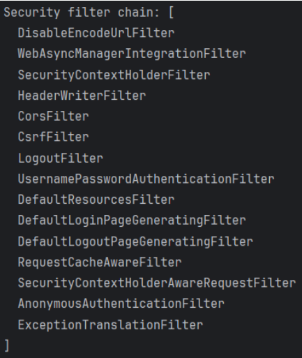내가 직접 구성한 SecurityFilterChain 안에 어떤 필터들이 포함되어 있는지 눈으로 확인해볼 수도 있다. HttpSecurity에 Configurer를 직접 추가하지 않더라도, Spring Security는 자체적으로 동작하기 위해 필요한 여러 기본 필터들을 자동으로 생성해서 등록해준다.