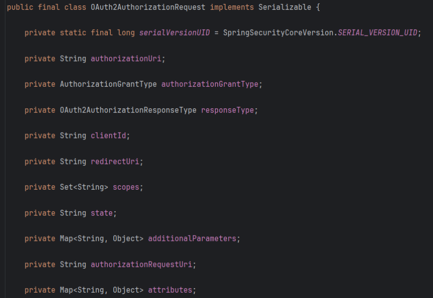OAuth2AuthorizationRequest 안에는 위에서 사용자의 요청을 저장하기 위한 여러가지 여러 정보들이 포함되어 있다.