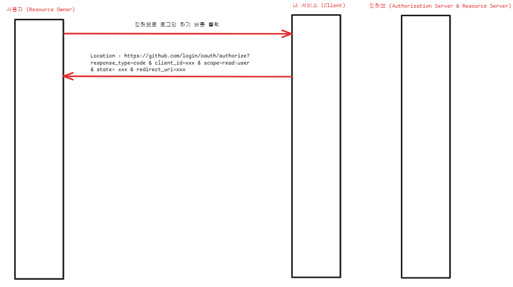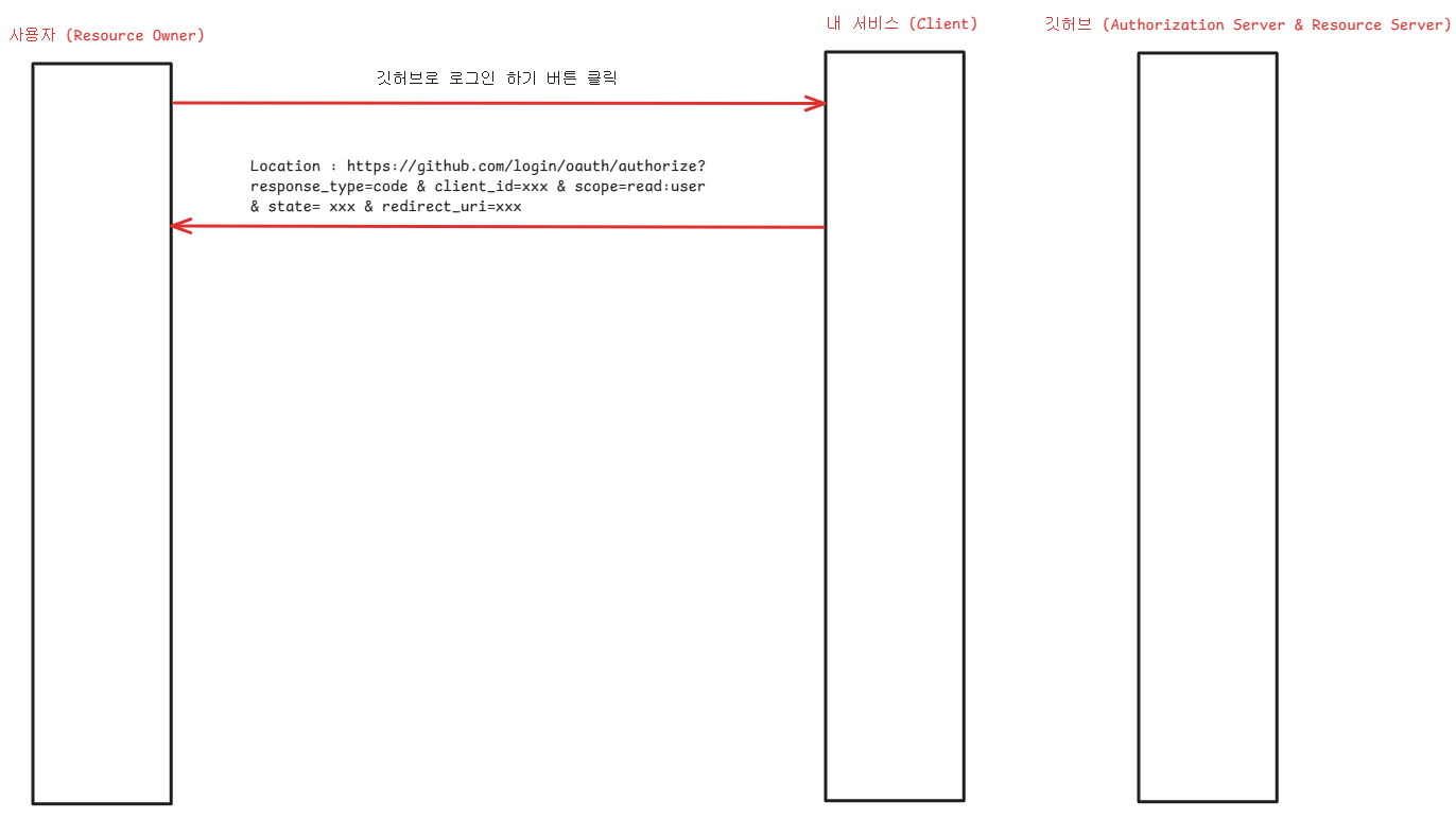 사용자가 "깃허브로 로그인" 버튼을 클릭하면, 내 서비스는 사용자를 GitHub 로그인 페이지로 리다이렉트 하면서 쿼리 스트링에 response_type, client_id, scope, state, redirect_uri 등의 파라미터를 함께 전달한다.