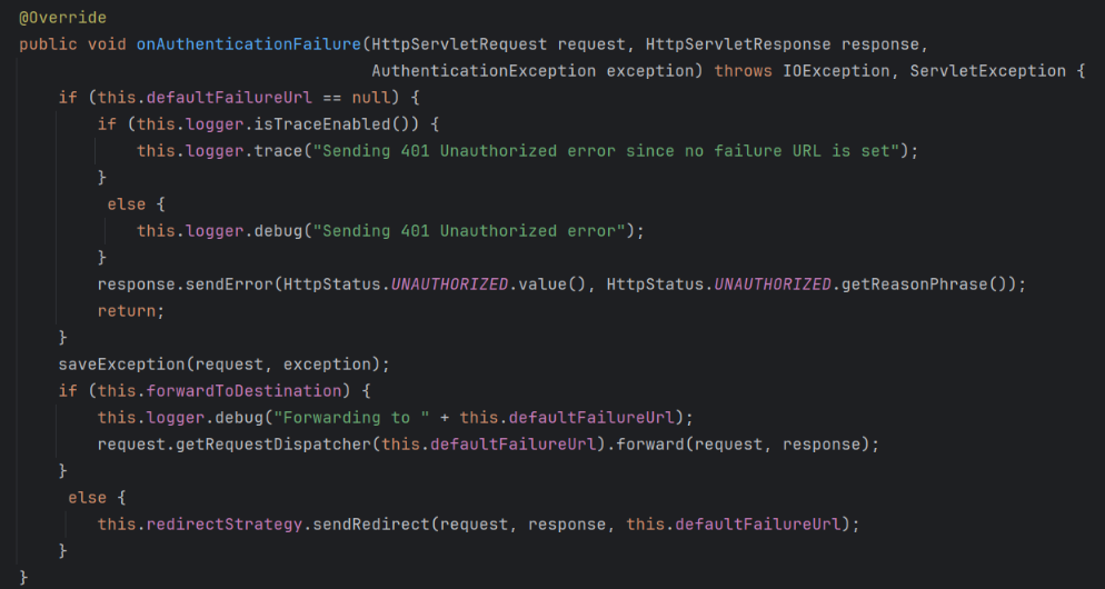이를 별도로 커스터마이징하지 않으면, 기본적으로 SimpleUrlAuthenticationFailureHandler가 처리한다. 이 구현체는 인증 실패 시 실패 URL로 포워드하거나 리다이렉트하고, 설정되어 있지 않으면 401 에러를 응답으로 보낸다. 하지만 나는 API 서버를 개발하고 있기 때문에, 그냥 로그를 남기고 JSON 형태의 에러 응답을 반환하도록 커스터마이징했다.