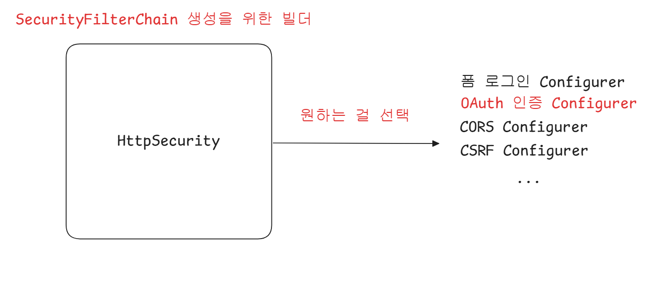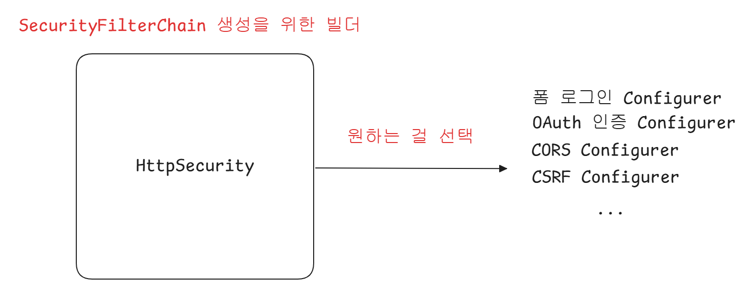 이미 Spring Security에서 만들어 놓은 인증, 인가, 기타 보안 처리에 관한 Configurer들이 있으며, 이들을 HttpSecurity라는 빌더를 통해 API 레벨로 사용하면, 우리의 SecurityFilterChain에 필요한 필터들이 자동으로 생성된다고 이해했다.