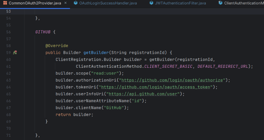 application.yml에 정의된 환경변수와 CommonOAuth2Provider를 통해 GitHub 관련 URL 등을 자동으로 설정해준다. 만약 이 과정을 더 세부적으로 제어하고 싶다면, ClientRegistration에 대해서 알아보면 된다.