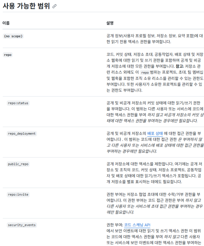 scope에 대한 더 자세한 내용은 Github 공식문서에 잘 정리되어 있으며, 우리 서비스에 필요한 권한 범위를 정확히 지정해 사용하면 된다. state와 redirect_uri는 뒤에서 정리할 생각이다.