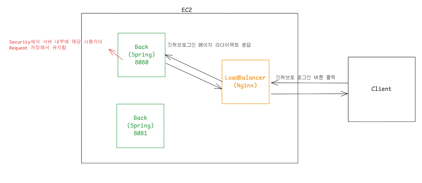 이 과정에서 사용자의 리다이렉트 전 요청 정보를 임시로 저장하고, 사용자가 GitHub에서 로그인하여 임시 코드가 발급된 후, 리다이렉트된 페이지로 돌아오면 서버는 저장된 요청 정보와 리다이렉트 후 돌아온 요청을 비교한다.