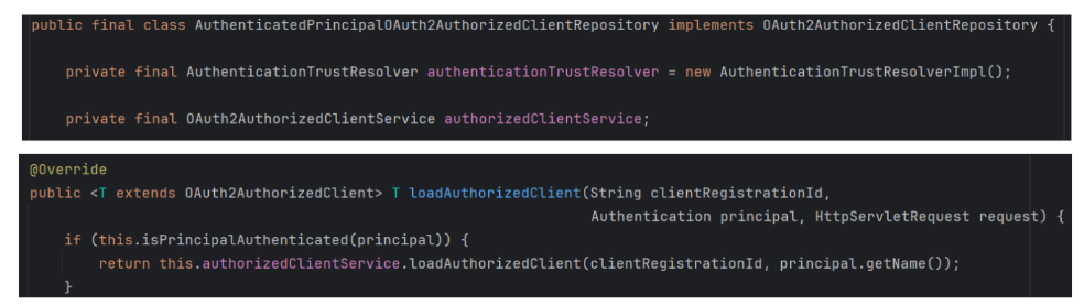 하지만 내부를 살펴본 결과, 예상과 달리 Repository는 단순히 요청 스코프에서의 임시 저장 역할만 수행하고 있었고, 실질적인 저장 및 조회 로직은 OAuth2AuthorizedClientService에 집중되어 있었다.