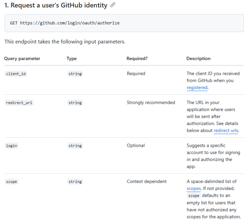 깃허브 로그인 페이지에 어떤 쿼리 파라미터를 함께 보내야 하는지에 대한 설명은 공식문서에 잘 나와 있다.