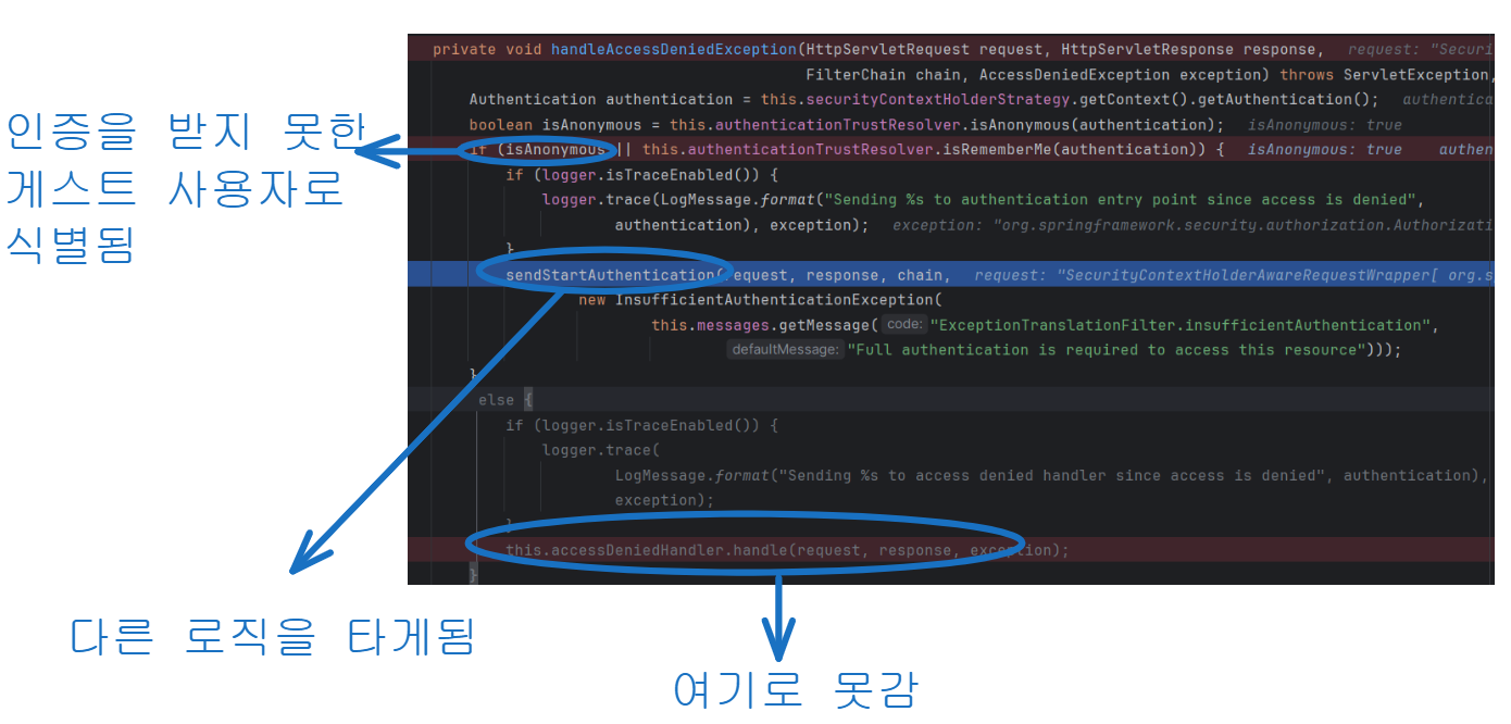하지만, 만약 JWT가 없는, 즉 비회원 사용자가 인증이나 인가가 필요한 엔드포인트로 요청을 보내오는 경우는 다르게 처리된다. 인가는 반드시 인증이 된 이후에 처리되어야 하기 때문에 .authenticated()를 설정했든 .hasRole()을 설정했든 모두 인증이 먼저 필요한 엔드포인트라고 생각하면 된다.