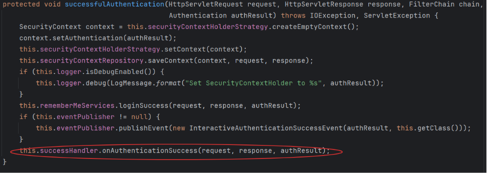 해당 메서드의 마지막 부분에서 AuthenticationSuccessHandler의 인증 성공 메서드를 실행하는 것을 확인할 수 있다. 즉, 이 핸들러를 커스터마이징하여 OAuth 로그인에 성공한 사용자 요청을 제어할 수 있다. 이를 통해, 로그인 성공 후 JWT를 발급하거나 추가적인 후속 작업을 자유롭게 처리할 수 있다.