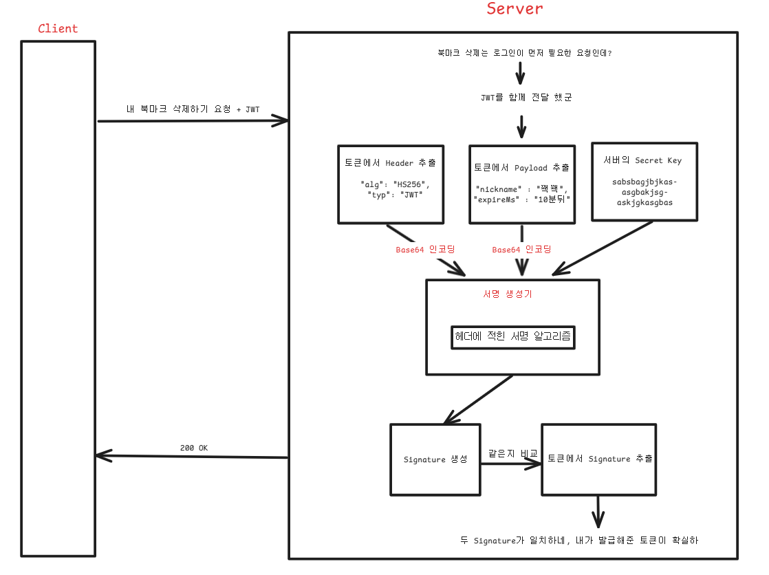 어떤 사용자가 로그인된 회원만 할 수 있는 요청과 함께 JWT를 보내오면, 서버는 먼저 해당 토큰에서 Header와 Payload를 추출한 뒤, 서버측의 SecretKey를 이용해 토큰을 발급할 때와 같은 방식으로 Signature를 생성해 본다.