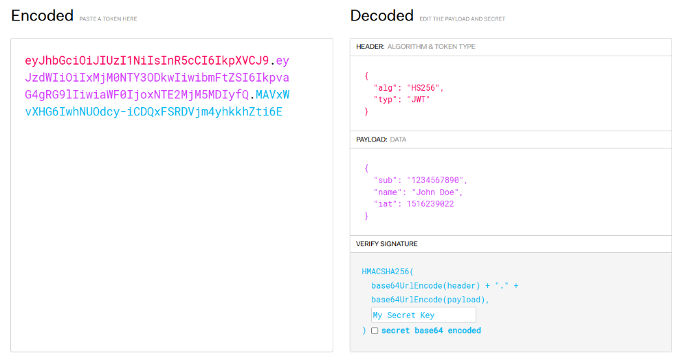 예를 들어, 위의 JWT 예시에서는 HS256이라는 알고리즘을 통해 서명과 검증을 진행한다. HS256은 대칭키 방식의 서명 알고리즘으로 서명과 검증에 동일한 키를 사용한다.